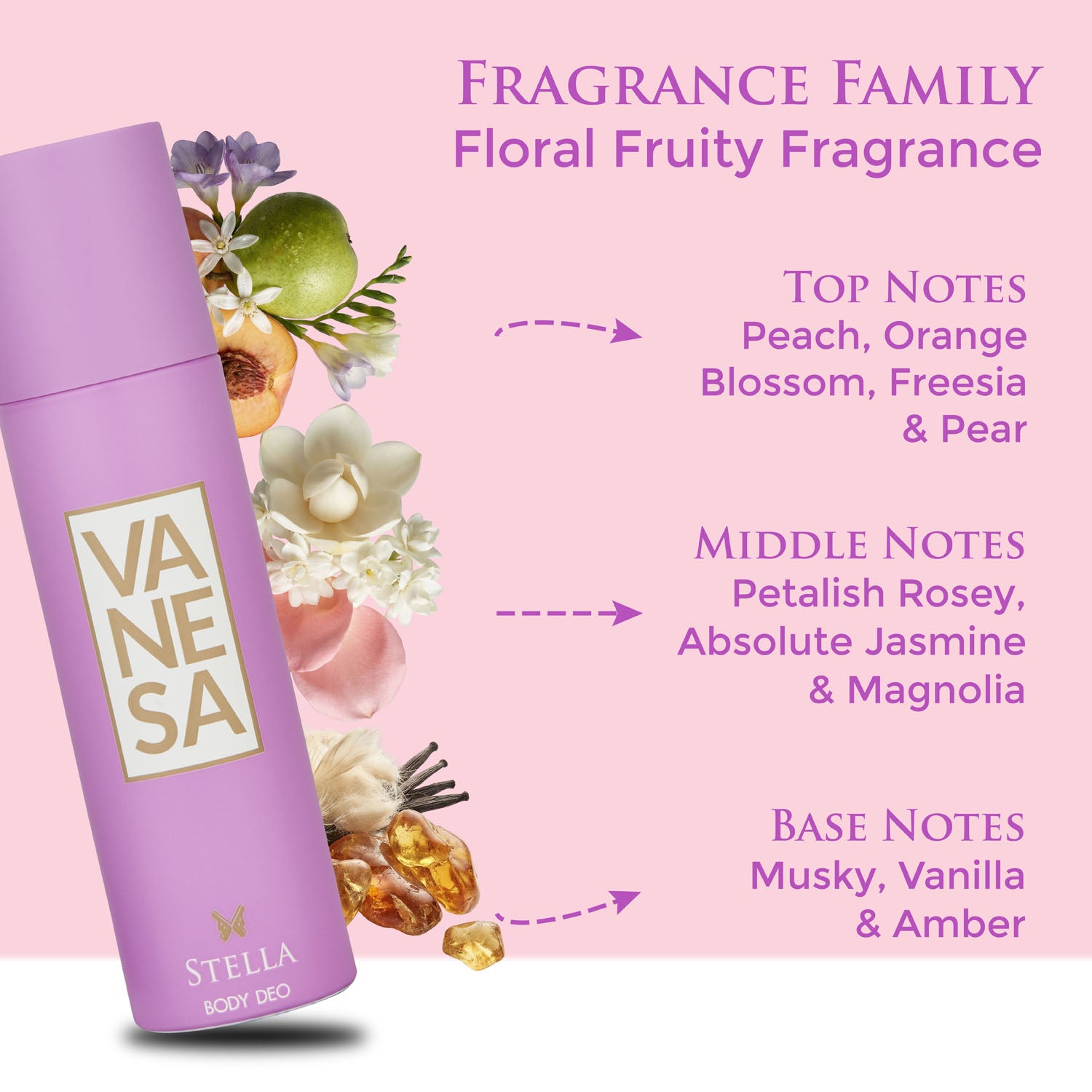 Vanesa Stella Body Deo is made for days when you want to feel fresh, pretty and effortlessly put together. The fragrance begins with a bright burst of peach, freesia and orange blossom. It then flows into soft rose, magnolia and jasmine absolute, adding a warm floral charm that feels delicate and feminine.